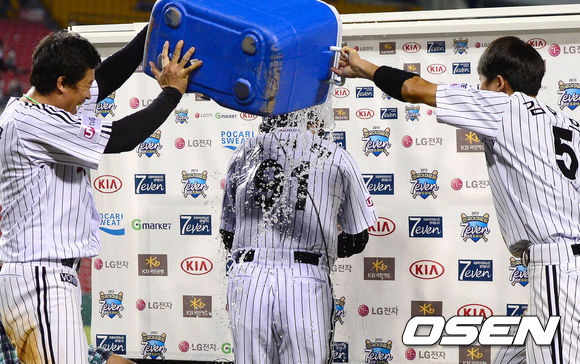 5일 오후 서울 잠실구장에서 열린 '2013 한국야쿠르트 세븐 프로야구' LG 트윈스와 두산 베어스의 경기 종료 후 김기태 감독이 인터뷰 중 이병규, 김용의로부터 물세례를 받고 있다.