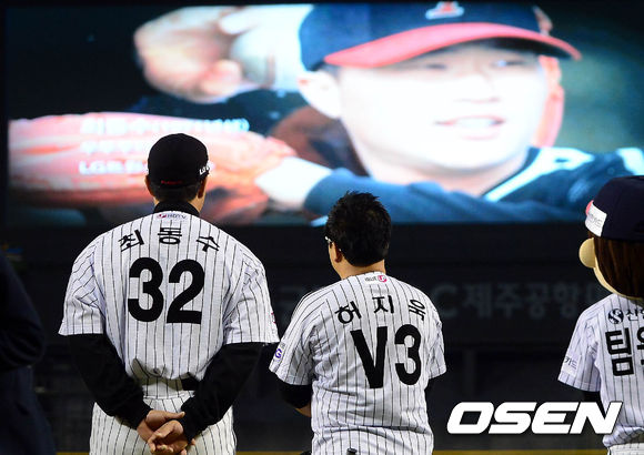 5일 오후 서울 잠실구장에서 열린 '2013 한국야쿠르트 세븐 프로야구' LG 트윈스와 두산 베어스의 경기 종료 후 최동수가 은퇴식을 갖고 있다.