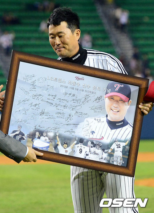 5일 오후 서울 잠실구장에서 열린 '2013 한국야쿠르트 세븐 프로야구' LG 트윈스와 두산 베어스의 경기 종료후 최동수가 은퇴식에서 기념 액자를 받고 기뻐하고 있다.