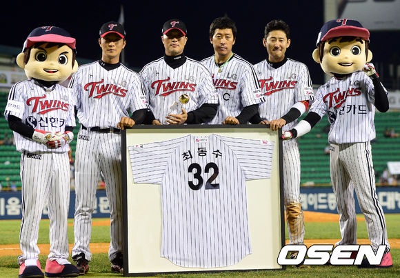5일 오후 서울 잠실구장에서 열린 '2013 한국야쿠르트 세븐 프로야구' LG 트윈스와 두산 베어스의 경기 종료 후 최동수가 은퇴식에서 동료들과 기념촬영을 하고 있다.