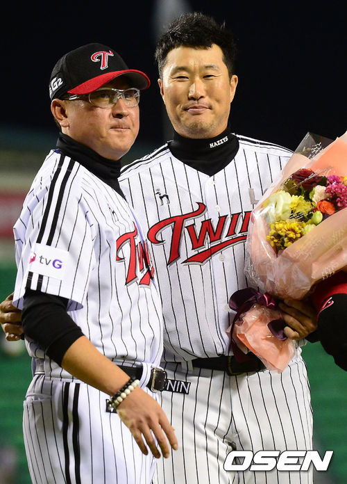 5일 오후 서울 잠실구장에서 열린 '2013 한국야쿠르트 세븐 프로야구' LG 트윈스와 두산 베어스의 경기 종료 후 최동수의 은퇴식이 열렸다. 은퇴식에서 김기태 감독이 최동수에게 꽃다발을 전달하고 있다.