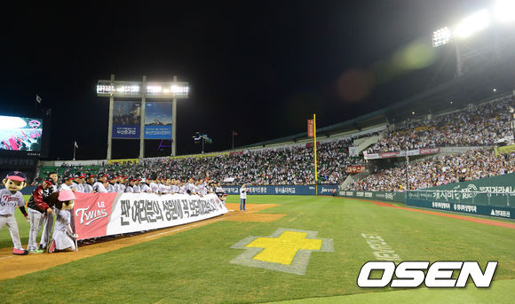5일 오후 서울 잠실구장에서 열린 '2013 한국야쿠르트 세븐 프로야구' LG 트윈스와 두산 베어스의 경기 종료 후 LG 선수들이 팬들에게 인사를 하고 있다.