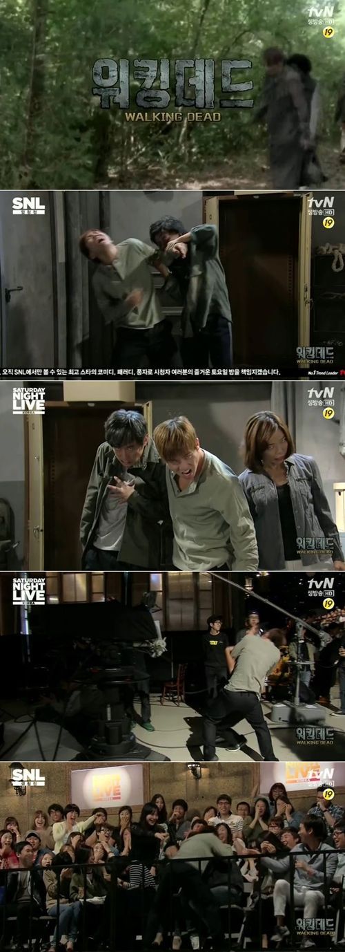 5일 오후 방송된 케이블채널 tvN 'SNL코리아'의 코너인 '워킹데드'에서는 크루인 유세윤, 김원해, 정명옥이 좀비떼에 습격당하는 모습이 그려졌다.