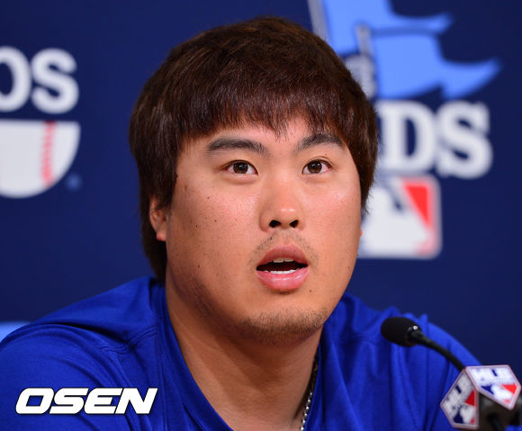 6일 (이하 한국시간) 미국 캘리포니아주 로스앤젤레스 다저스타디움에서  2013 메이저리그 LA 다저스와 애틀랜타 브레이브스와 경기를 하루 앞두고 3차전 다저스 선발로 나서는 류현진이 기자회견 및 훈련을 가졌다. 류현진이 기자회견실에서 공식 인터뷰를 하고 있다.
