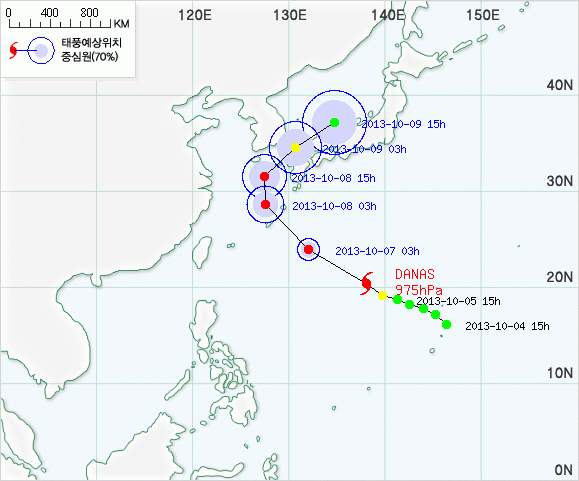 다나스는 중심기압 940h㎩에 최대풍속 초속 20m의 강한 비바람을 동반한 소형태풍으로 일본 남쪽 해상으로 북상 중이다.
