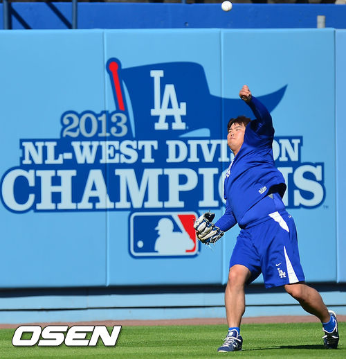 6일 (이하 한국시간) 미국 캘리포니아주 로스앤젤레스 다저스타디움에서 2013 메이저리그 LA 다저스와 애틀랜타 브레이브스와 경기를 하루 앞두고 3차전 다저스 선발로 나서는 류현진이 기자회견 및 훈련을 가졌다. 류현진이 캐치볼을 하고 있다.
