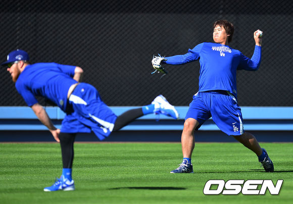 6일 (이하 한국시간) 미국 캘리포니아주 로스앤젤레스 다저스타디움에서 열린 2013 메이저리그 LA 다저스와 애틀랜타 브레이브스와 경기를 하루 앞두고 3차전 다저스 선발로 나서는 류현진이 기자회견 및 훈련을 가졌다. 그라운드 위에서 류현진이 캐치볼을 하고 있다.