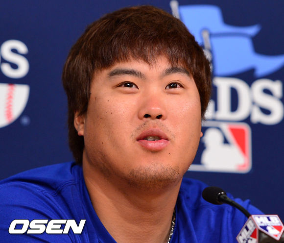 6일 (이하 한국시간) 미국 캘리포니아주 로스앤젤레스 다저스타디움에서 열린 2013 메이저리그 LA 다저스와 애틀랜타 브레이브스와 경기를 하루 앞두고 3차전 다저스 선발로 나서는 류현진이 기자회견 및 훈련을 가졌다. 류현진이 인터뷰를 하며 미소짓고 있다.