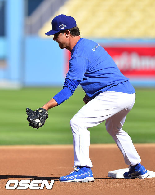 6일 (이하 한국시간) 미국 캘리포니아주 로스앤젤레스 다저스타디움에서 열린 2013 메이저리그 LA 다저스와 애틀랜타 브레이브스와 경기를 하루 앞두고 3차전 다저스 선발로 나서는 류현진이 기자회견 및 훈련을 가졌다. 돈 매팅리 감독이 수비훈련을 돕고 있다.