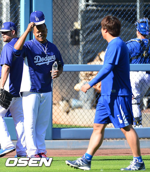 6일 (이하 한국시간) 미국 캘리포니아주 로스앤젤레스 다저스타디움에서 열린 2013 메이저리그 LA 다저스와 애틀랜타 브레이브스와 경기를 하루 앞두고 3차전 다저스 선발로 나서는 류현진이 기자회견 및 훈련을 가졌다. 그라운드 위에서 몸을 풀고 있는 류현진을 본 볼케스가 모자를 벗어 인사하고 있다.