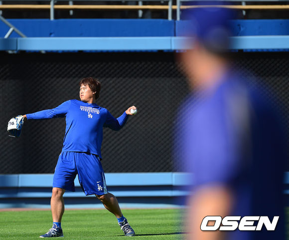 6일 (이하 한국시간) 미국 캘리포니아주 로스앤젤레스 다저스타디움에서 2013 메이저리그 LA 다저스와 애틀랜타 브레이브스와 경기를 하루 앞두고 3차전 다저스 선발로 나서는 류현진이 기자회견 및 훈련을 가졌다. 류현진이 그라운드에서 캐치볼을 하고 있다.
