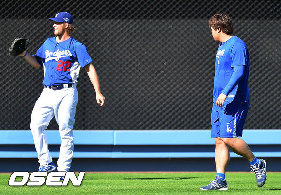6일 (이하 한국시간) 미국 캘리포니아주 로스앤젤레스 다저스타디움에서 2013 메이저리그 LA 다저스와 애틀랜타 브레이브스와 경기를 하루 앞두고 3차전 다저스 선발로 나서는 류현진이 기자회견 및 훈련을 가졌다. 그라운드 위에서 류현진이 커쇼의 피칭을 지켜보고 있다.