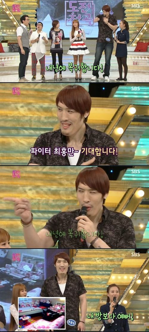 최홍만은 6일 오전 방송된 SBS 예능프로그램 '도전1000곡'에서 은퇴여부를 묻는 질문에 "내년에 복귀할 것이다. 요새 몸을 만들고 있다"라고 말하며 복귀를 예고했다.