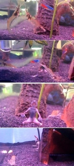 이때 격투 중인 새우들 틈에 개구리 한 마리가 나타나 싸움을 말리는 듯한 태도를 취해 눈길을 끈다. 마치 새우들의 싸움을 말리면서 자신의 영역임을 강조하는 듯한 모습이다. 개구리의 '중재(?)'로 인해 새우들의 싸움은 멈췄다.