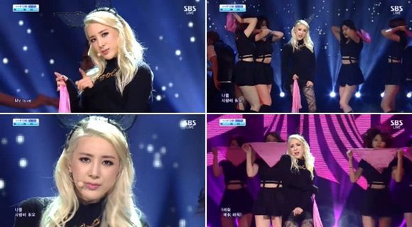 서인영은 6일 방송된 SBS '인기가요'에서 신곡 '나를 사랑해줘'를 부르며 댄서들과 스카프 댄스를 선보였다. 그는 스카프 양 쪽을 잡고 몸을 움직이는 동작으로 여성스러우면서도 러블리한 이미지를 연출했다.