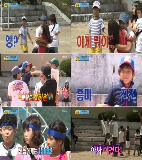 짝꿍 운동회의 백미는 '이어달리기'였다. 훌라후프를 돌린 후 그물을 통과, 결승선까지 전력질주하는 경기에서는 아이들의 운동감이 여실히 드러났다. 불타는 승부욕을 가진 준수가 달리기를 하다 신발이 벗겨지고, 준영이가 앞구르기를 하지 못해 한바탕 웃음바다가 됐지만 게임에 임하는 자세는 진지했다. 특히 마지막 주자로 나선 윤민수는 그물을 통과하며 뜯어낼 듯한 괴력을 발휘해 웃음을 자아냈다.
