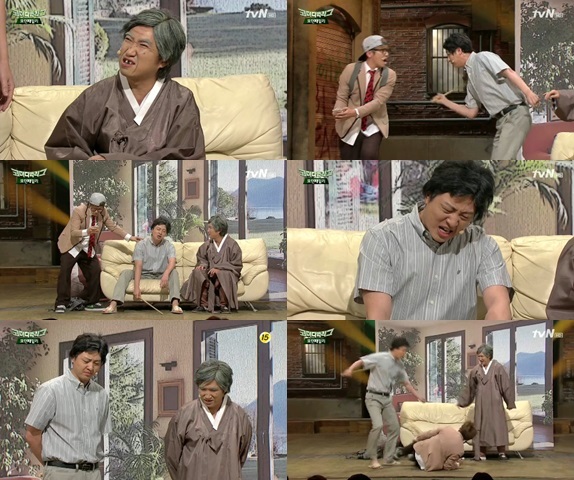 이날 할아버지로 분한 장동민은 “우리 손주가 왜 아직도 안 오냐”며 유세윤을 기다렸다. 유세윤의 늦은 귀가에 아버지 유상무는 “이 녀석 할머니 제사라고 일찍 오라고 하지 않았냐”고 훈계했지만, 유세윤은 혼나는 와중에도 스마트폰만 집중했다.