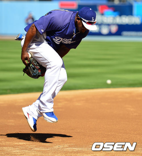 7일 (이하 한국시간) 미국 캘리포니아주 로스앤젤레스 다저스타디움에서 2013 메이저리그 LA 다저스와 애틀랜타 브레이브스와 경기가 열릴 예정인 가운데 양 팀 훈련시간에 다저스 후안 유리베가 수비훈련을 하며 묘기를 보여주고 있다.