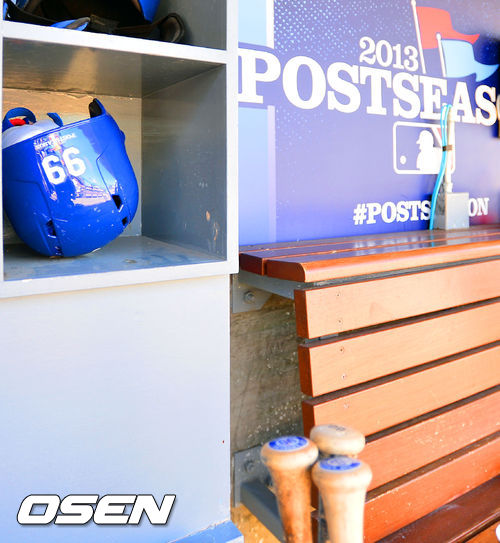 7일 (이하 한국시간) 미국 캘리포니아주 로스앤젤레스 다저스타디움에서 2013 메이저리그 LA 다저스와 애틀랜타 브레이브스와 경기가 열릴 예정인 가운데 양 팀 훈련시간에 류현진의 배트와 헬멧이 덕아웃에 놓여있다.