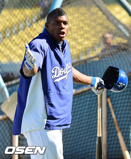7일 (이하 한국시간) 미국 캘리포니아주 로스앤젤레스 다저스타디움에서 2013 메이저리그 LA 다저스와 애틀랜타 브레이브스와 경기가 열릴 예정인 가운데 양 팀 훈련시간에 다저스 푸이그가 사인을 보내고 있다.