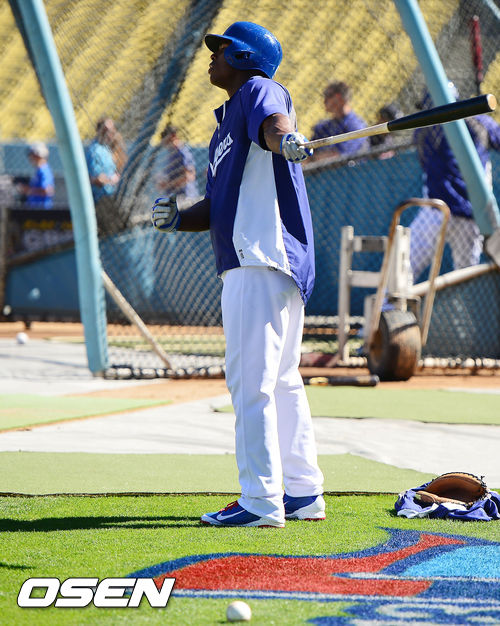 7일 (이하 한국시간) 미국 캘리포니아주 로스앤젤레스 다저스타디움에서 2013 메이저리그 LA 다저스와 애틀랜타 브레이브스와 경기가 열릴 예정인 가운데 양 팀 훈련시간에 다저스 푸이그가 타격 훈련을 기다리며 펑고를 쳐주고 있다.