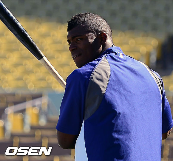 7일 (이하 한국시간) 미국 캘리포니아주 로스앤젤레스 다저스타디움에서 2013 메이저리그 LA 다저스와 애틀랜타 브레이브스와 경기가 열릴 예정인 가운데 양 팀 훈련시간에 다저스 야시엘 푸이그가 타격 연습을 기다리며 스윙 연습을 하고 있다.