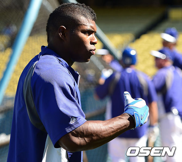 7일 (이하 한국시간) 미국 캘리포니아주 로스앤젤레스 다저스타디움에서 2013 메이저리그 LA 다저스와 애틀랜타 브레이브스와 경기가 열릴 예정인 가운데 양 팀 훈련시간에 다저스 야시엘 푸이그가 타격 연습을 기다리며 사인을 보내고 있다.