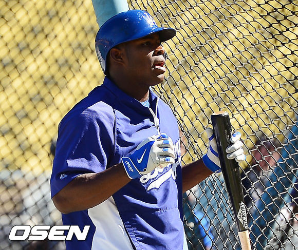 7일 (이하 한국시간) 미국 캘리포니아주 로스앤젤레스 다저스타디움에서 2013 메이저리그 LA 다저스와 애틀랜타 브레이브스와 경기가 열릴 예정인 가운데 양 팀 훈련시간에 타격훈련을 마친 다저스 푸이그가 으샤으샤를 하고 있다.