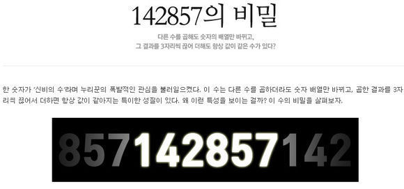 ‘142857×1=142857’, ‘142857×2=285714’, ‘142857×3=428571’, ‘142857×4=571428’, ‘142857×5=714285’, ‘142857×6=857142’로 모든 결과가 142857과 배열만 다른 숫자가 된다.