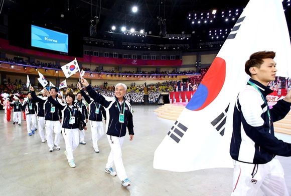 이날 한국 선수단은 펜싱의 구본길을 기수로 해 참가 9개국 중 일본에 이어 4번째로 입장했다.