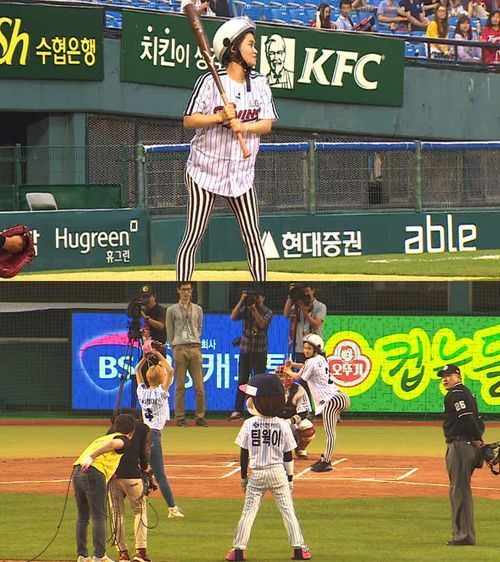 개그우먼 김신영이 배우 클라라와 걸그룹 크레용팝의 특징을 따서 '클라용팝'이라는 이름으로 파격적인 시구 패션을 선보였다.