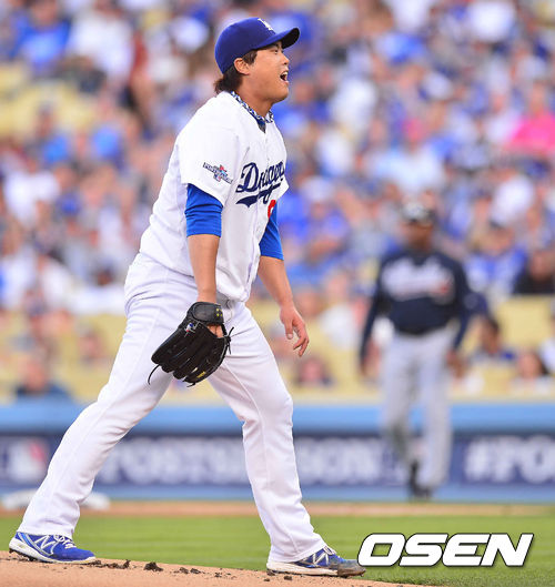7일 (이하 한국시간) 미국 캘리포니아주 로스앤젤레스 다저스타디움에서 열린 2013 메이저리그 LA 다저스와 애틀랜타 브레이브스의 디비전시리즈 3차전 경기, 1회초 2사 1루 다저스 선발투수 류현진이 애틀랜타 맥칸에게 볼넷을 허용한 후 아쉬워하고 있다.