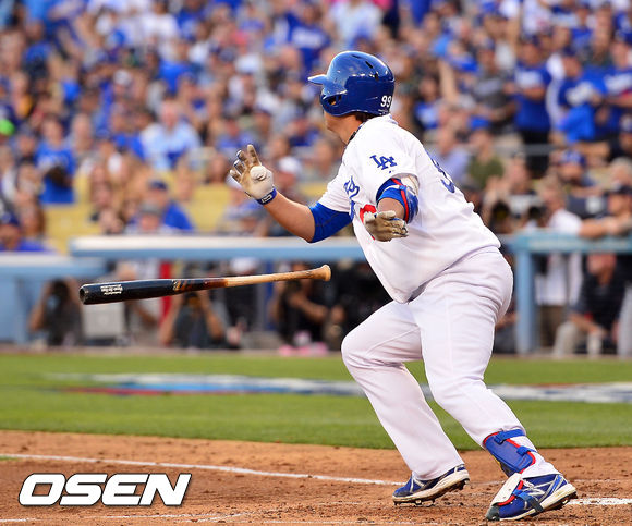 7일 (이하 한국시간) 미국 캘리포니아주 로스앤젤레스 다저스타디움에서 열린 2013 메이저리그 LA 다저스와 애틀랜타 브레이브스의 디비전시리즈 3차전 경기, 2회말 1사 만루 다저스 류현진이 우익수 희생플라이로 첫 타점 타구를 날리고 있다.