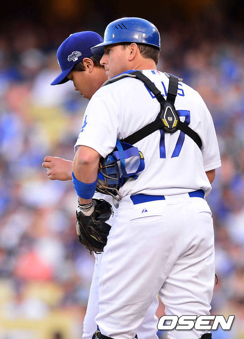7일 (이하 한국시간) 미국 캘리포니아주 로스앤젤레스 다저스타디움에서 열린 2013 메이저리그 LA 다저스와 애틀랜타 브레이브스의 디비전시리즈 3차전 경기, 1회초 2실점 허용한 다저스 선발투수 류현진이 A.J.엘리스의 격려를 받고 있다.