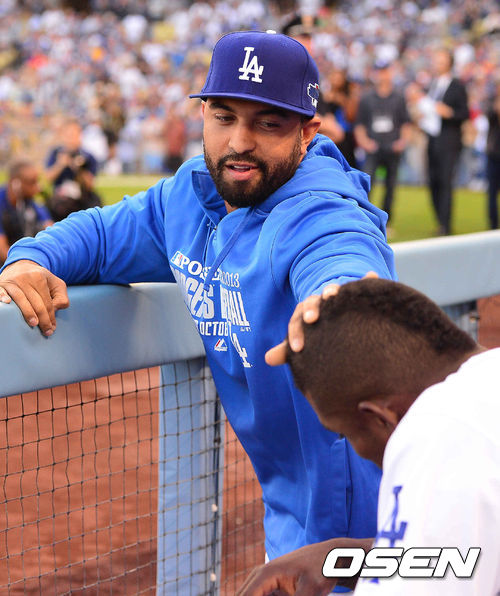 7일 (이하 한국시간) 미국 캘리포니아주 로스앤젤레스 다저스타디움에서 열린 2013 메이저리그 LA 다저스와 애틀랜타 브레이브스의 디비전시리즈 3차전 경기에 앞서 맷켐프가 푸이그와 장난을 치고 있다.