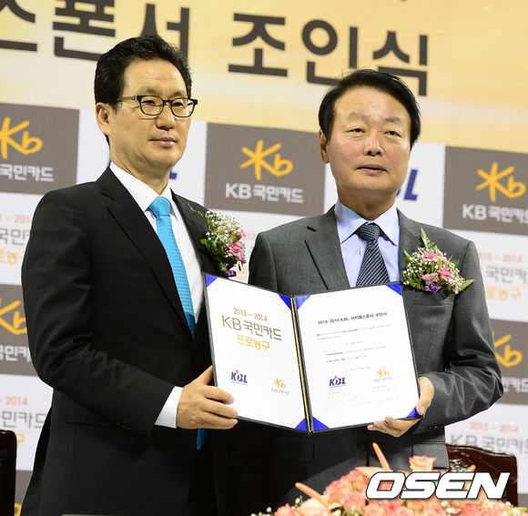 미디어데이에 앞서 타이틀 스폰서 조인식을 가지며 KB국민카드 심재오 사장과 한선교 KBL총재가 포토타임을 하고 있다.
