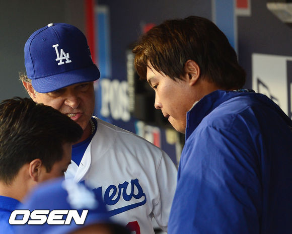 7일 (이하 한국시간) 미국 캘리포니아주 로스앤젤레스 다저스타디움에서 열린 2013 메이저리그 LA 다저스와 애틀랜타 브레이브스의 디비전시리즈 3차전 경기,3회를 마친 류현진이 덕아웃에서 돈 매팅리 감독과 얘기를 나누고 있다.