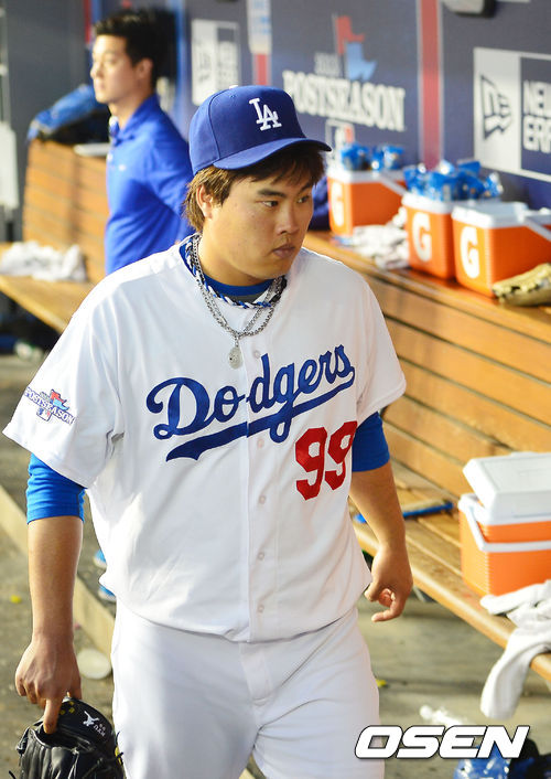 7일 (이하 한국시간) 미국 캘리포니아주 로스앤젤레스 다저스타디움에서 열린 2013 메이저리그 LA 다저스와 애틀랜타 브레이브스의 디비전시리즈 3차전 경기,3회말 2사 주자 교체된 다저스 류현진이 덕아웃에서 락커로 향하고 있다.