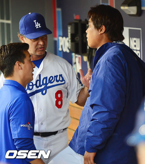 7일 (이하 한국시간) 미국 캘리포니아주 로스앤젤레스 다저스타디움에서 열린 2013 메이저리그 LA 다저스와 애틀랜타 브레이브스의 디비전시리즈 3차전 경기,3회를 마친 류현진이 덕아웃에서 돈 매팅리 감독과 얘기를 나누고 있다.