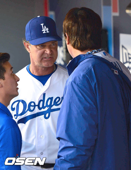 7일 (이하 한국시간) 미국 캘리포니아주 로스앤젤레스 다저스타디움에서 열린 2013 메이저리그 LA 다저스와 애틀랜타 브레이브스의 디비전시리즈 3차전 경기,3회말 마이클 영과 교체된 다저스 선발투수 류현진이 매팅리 감독과 이야기를 나누고 있다