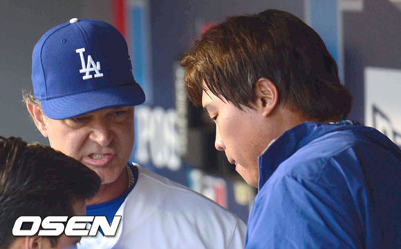 7일 (이하 한국시간) 미국 캘리포니아주 로스앤젤레스 다저스타디움에서 열린 2013 메이저리그 LA 다저스와 애틀랜타 브레이브스의 디비전시리즈 3차전 경기,3회말 다저스 류현진이 마이클 영과 교체후 매팅리 감독과 이야기를 나누고 있다.