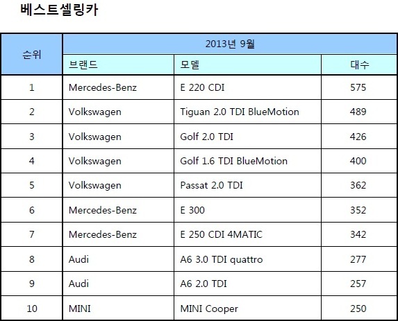 9월 베스트셀링 모델은 메르세데스-벤츠 'E220 CDI(575대)', 폭스바겐 '티구안 '티구안 2.0 TDI 블루모션(489대)', 폭스바겐 '골프 2.0 TDI(426대)' 순이었다.