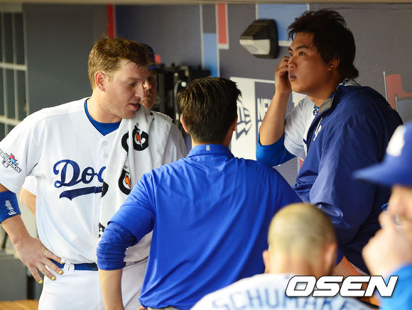 7일 (이하 한국시간) 미국 캘리포니아주 로스앤젤레스 다저스타디움에서 열린 2013 메이저리그 LA 다저스와 애틀랜타 브레이브스의 디비전시리즈 3차전 경기,3회를 마친 류현진이 덕아웃에서 A.J 엘리스와 얘기를 나누고 있다.