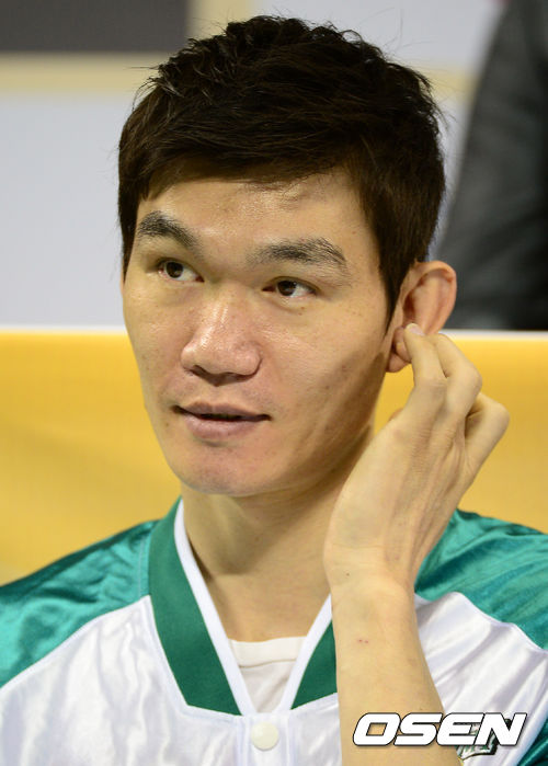 원주 동부 김주성이 질문에 생각을 하고 있다.