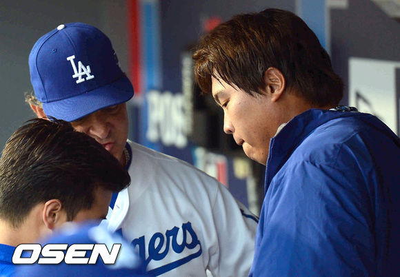 7일 (이하 한국시간) 미국 캘리포니아주 로스앤젤레스 다저스타디움에서 열린 2013 메이저리그 LA 다저스와 애틀랜타 브레이브스의 디비전시리즈 3차전 경기,3회말 다저스 류현진이 마이클 영과 교체후 매팅리 감독과 이야기를 나누고 있다.