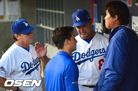 7일 (이하 한국시간) 미국 캘리포니아주 로스앤젤레스 다저스타디움에서 열린 2013 메이저리그 LA 다저스와 애틀랜타 브레이브스의 디비전시리즈 3차전 경기,3회말 다저스 류현진이 마이클 영과 교체후 매팅리 감독과 이야기를 나누고 있다.