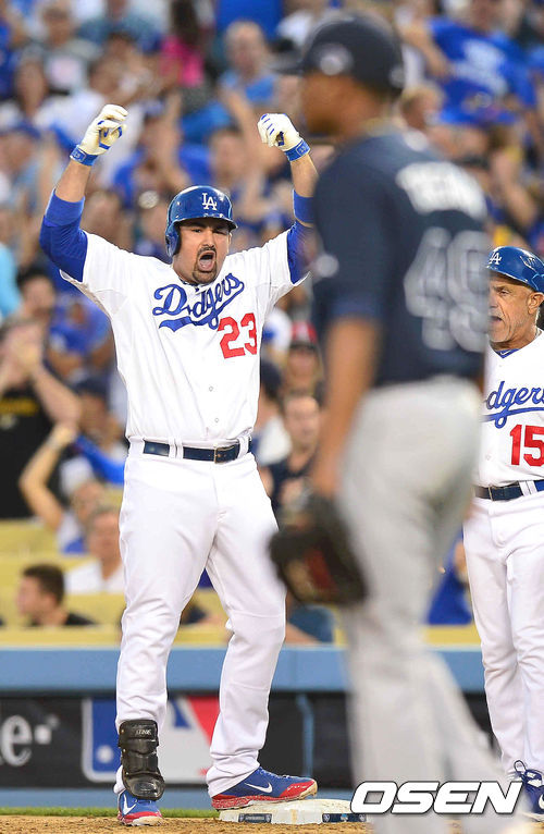 7일 (이하 한국시간) 미국 캘리포니아주 로스앤젤레스 다저스타디움에서 열린 2013 메이저리그 LA 다저스와 애틀랜타 브레이브스의 디비전시리즈 3차전 경기,3회말 무사 2루 다저스 곤잘레스가 재역전 1타점 적시타를 날리고 환호하고 있다.
