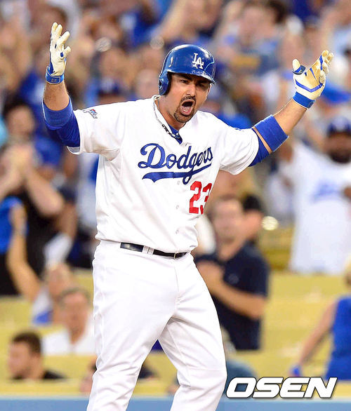 7일 (이하 한국시간) 미국 캘리포니아주 로스앤젤레스 다저스타디움에서 열린 2013 메이저리그 LA 다저스와 애틀랜타 브레이브스의 디비전시리즈 3차전 경기,3회말 무사 2루 다저스 곤잘레스가 재역전 1타점 적시타를 날리고 환호하고 있다.