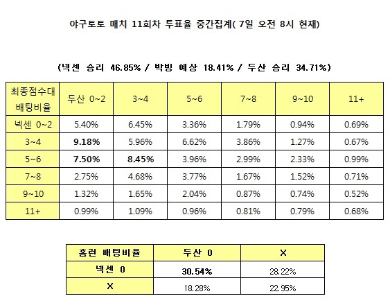 [야구토토] 국민체육진흥공단(www.kspo.or.kr)이 발행하는 체육진흥투표권 수탁사업자인 스포츠토토(www.sportstoto.co.kr)는 오는 8일 벌어지는 2013 프로야구 포스트시즌 준플레이오프 1차전 넥센-두산전을 대상으로 한 야구토토 매치 11회차 투표율 중간집계 결과 전체 참가자 가운데 넥센의 승리를 예측한 비율이 46.85%로 두산의 승리 예상 37.71% 보다 앞섰다고 밝혔으며, 양팀의 박빙 승부는 18.41%로 집계됐다.