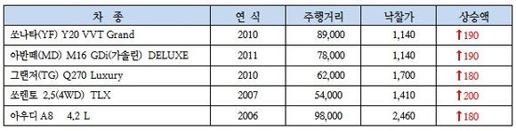 대형차보다는 경차와 SUV 수요가 많았던 10월 첫째 주 경매였다. 경차와 준중형, SUV, 상용 차량이 각각 낙찰률 70%를 넘었다. 주요 낙찰차량 현황은 표와 같다.